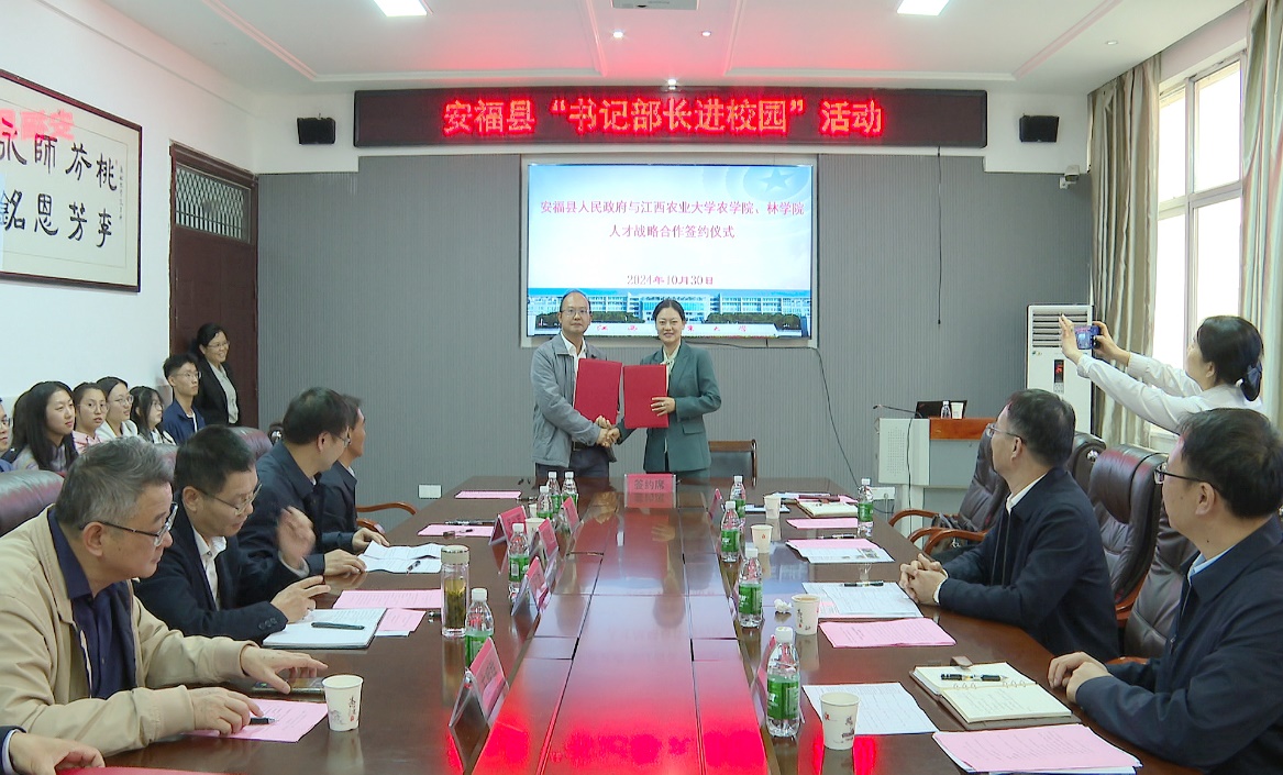 近日,安福縣委書記毛江虎一行來我校開展“書記部長進校園”活動,并與我校農學院、林學院簽訂戰略合作協議。我校副校長王文君,校招就處、校團委、農學院、林學院負責人及部分教師代表參加活動。