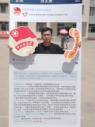 西部計劃志愿者邵浩展說:“我國脫貧攻堅正進入脫貧任務全面完成的決勝期、鄉村振興與脫貧攻堅的融合期、歷史機遇與矛盾挑戰的并存期,這其中青年的力量不可小覷。我將立足本職扶貧工作,為‘建設亮麗內蒙古,共圓偉大中國夢’揮灑青春熱血。”